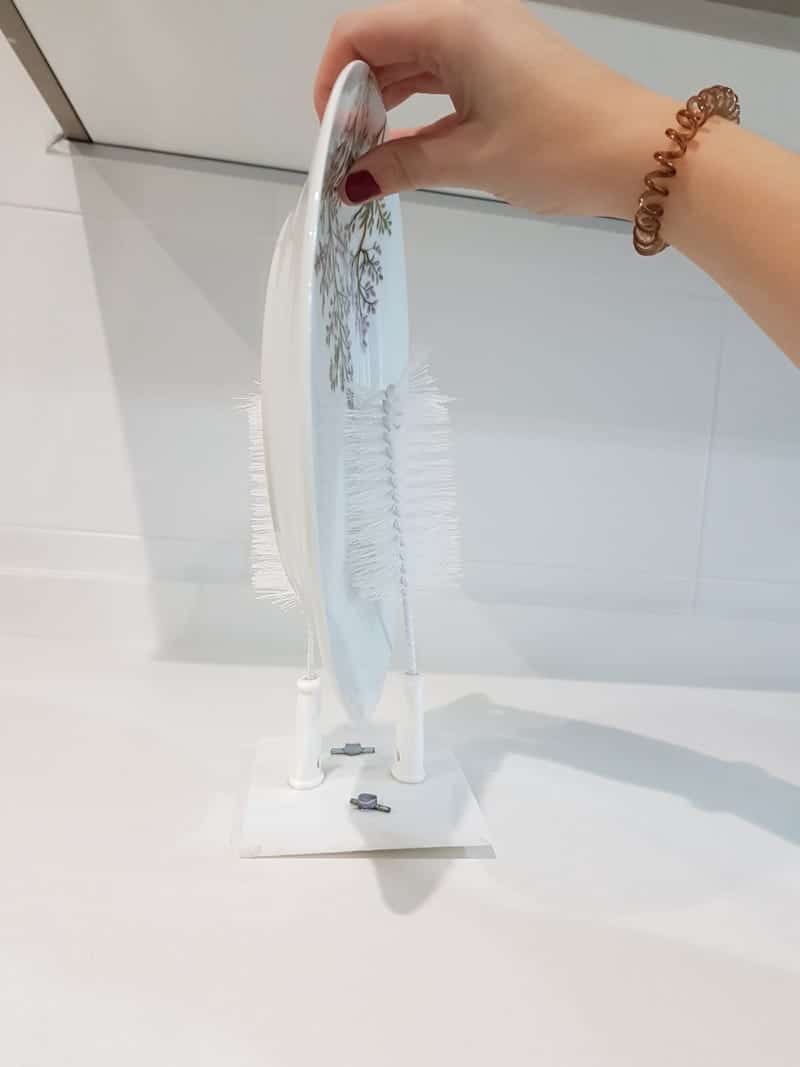 Friegaplatos y friegavasos. Como os comentábamos al inicio de este post, dentro de la actividad de cocina está incluida la limpieza de los utensilios que utilizamos. Por este motivo, hemos realizado la siguiente adaptación que permite fregar los platos y los vasos con una sola mano. El siguiente útil se fija al fregadero mediante unas ventosas y así la persona podrá pasar el plato entre ambos cepillos o introducir el vaso por uno de ellos para eliminar los restos de suciedad.
